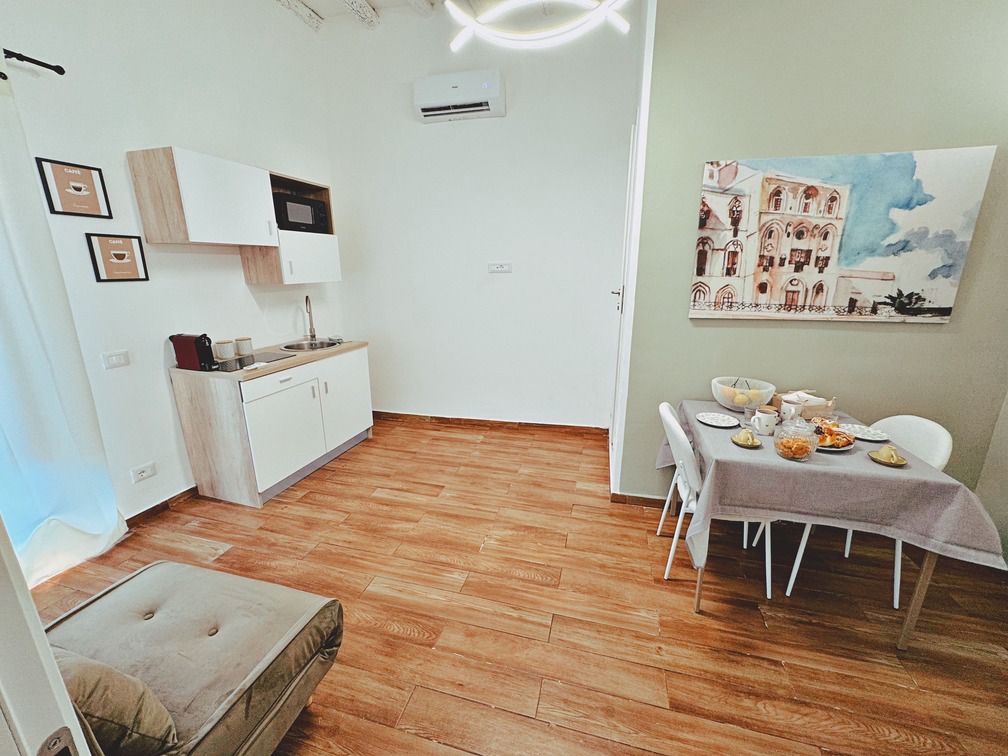 Accogliente e luminosa, la Zisa Room è un elegante mini appartamento che unisce il fascino di una dimora storica del ‘600 al comfort moderno. Dotata di una camera matrimoniale con possibilità di aggiungere un posto letto e bagno privato con piatto doccia, dispone anche di un balcone privato con vista sulla città, perfetto per iniziare la giornata con uno sguardo sul cuore pulsante di Palermo.